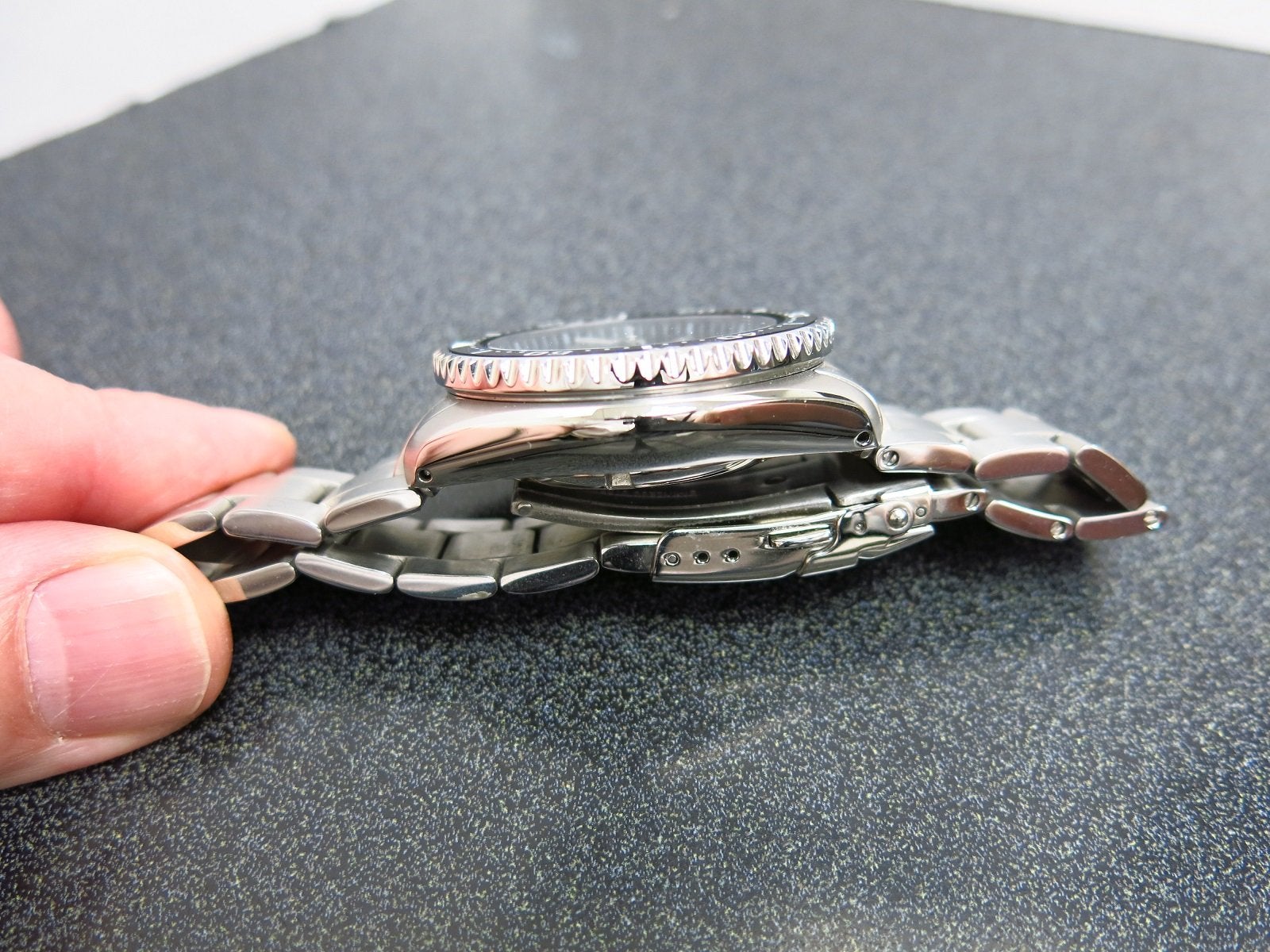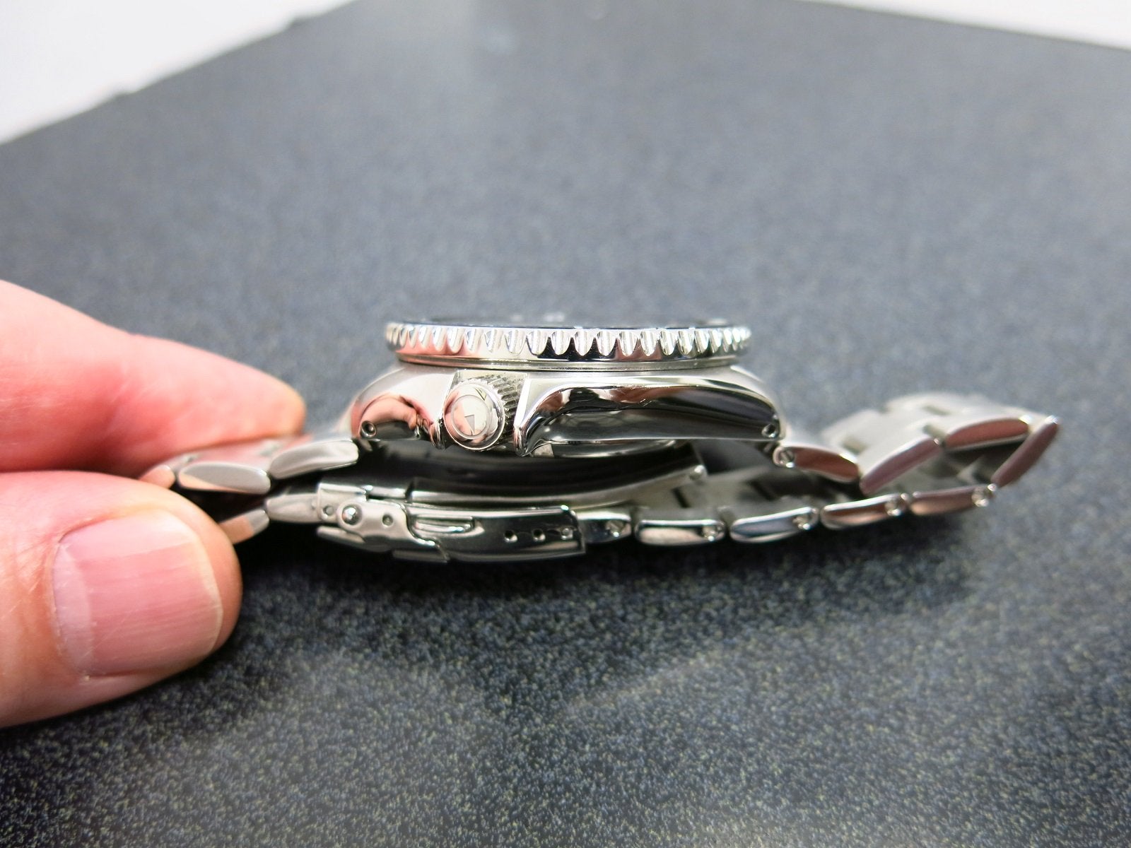 I wore this a few times mostly in the office and at home. Crown is smooth as well as the bezel and the lume is great. This is now sold out and it does not come up often for sale.