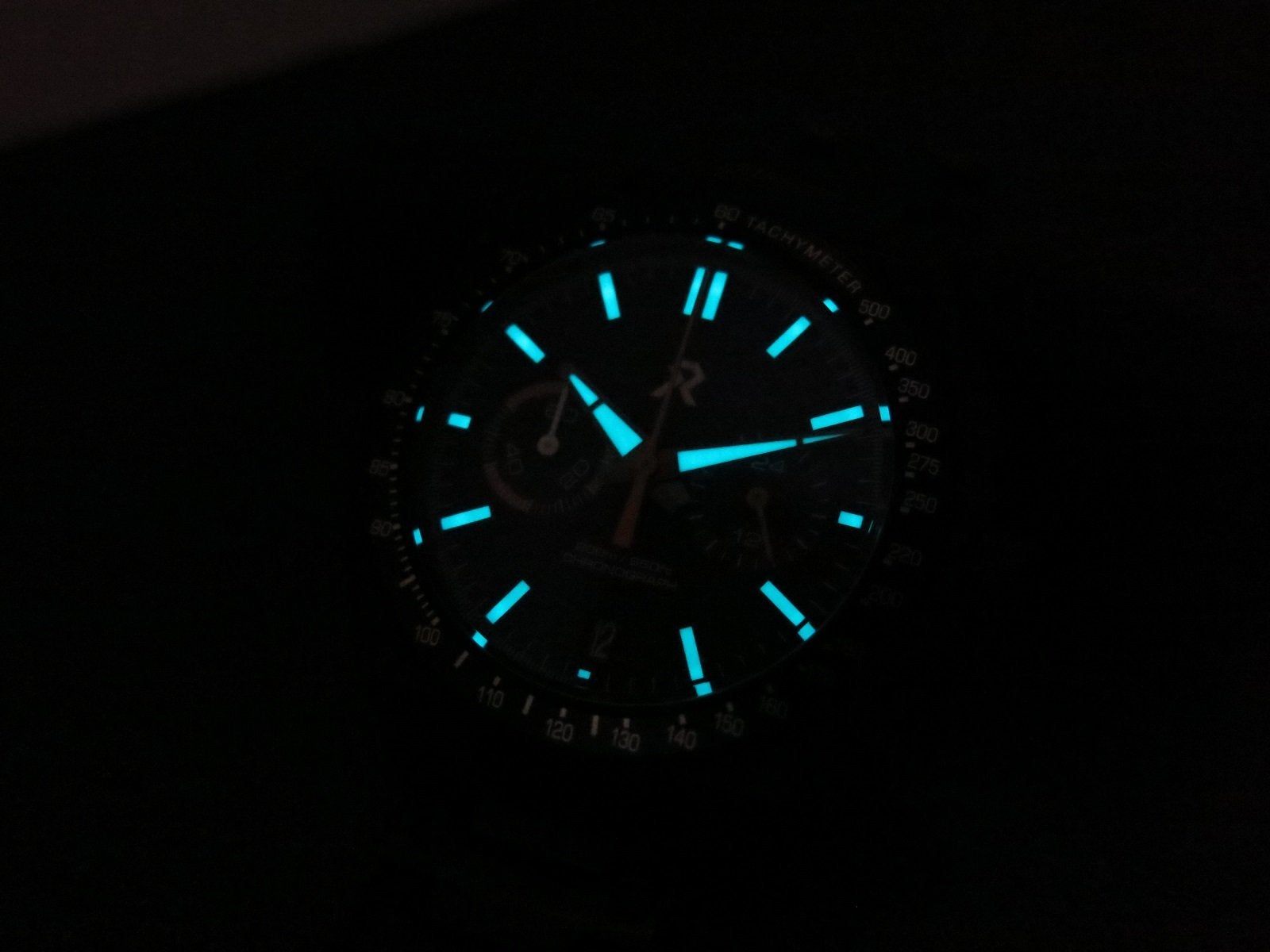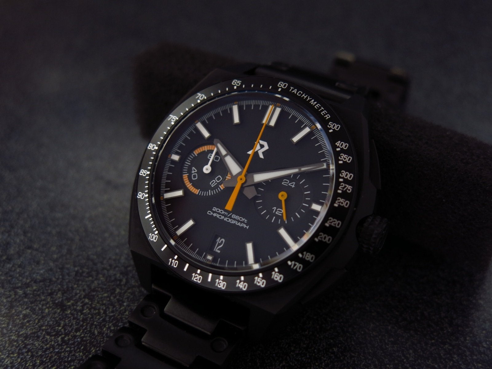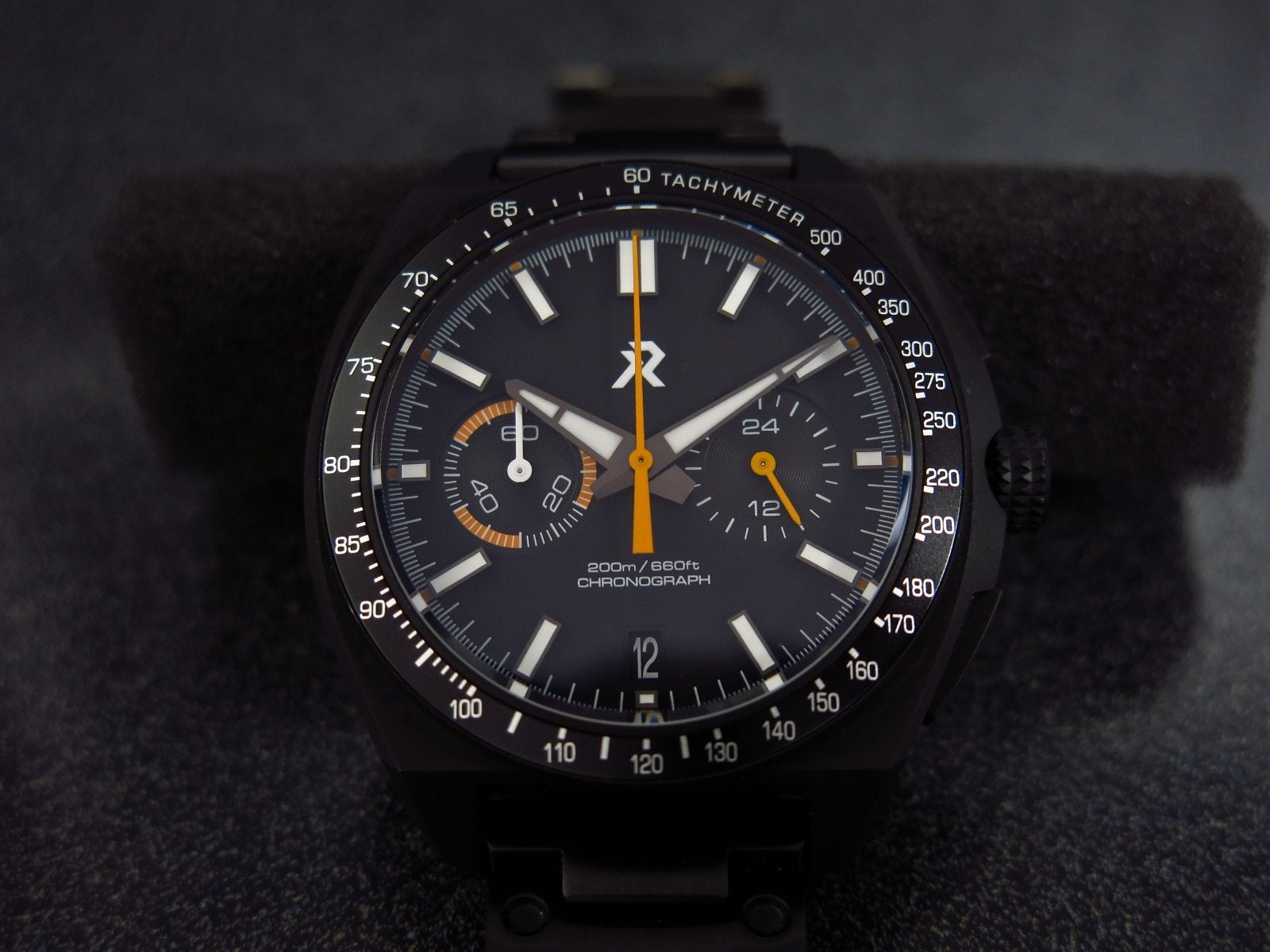 RZE Chonograph Valour, Titanium case black PVD coated, 42mm with 20mm lugs. White and orange accents made this very legible. Sapphire crystal and blue BGW9 lume. The watch is in excellent condition with only a small mark that I can see just above the top pusher. Everything works as it should, crown is smooth and positive, the pushers start and stop the seconds hand and reset it crisply and precisely to the 12 position.