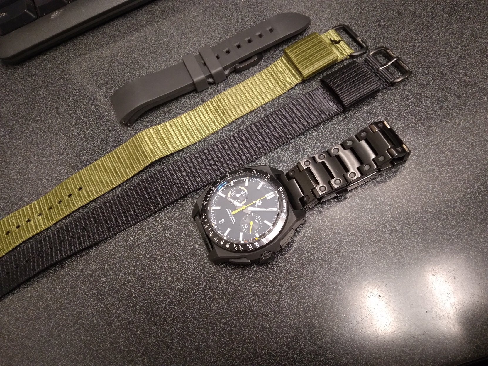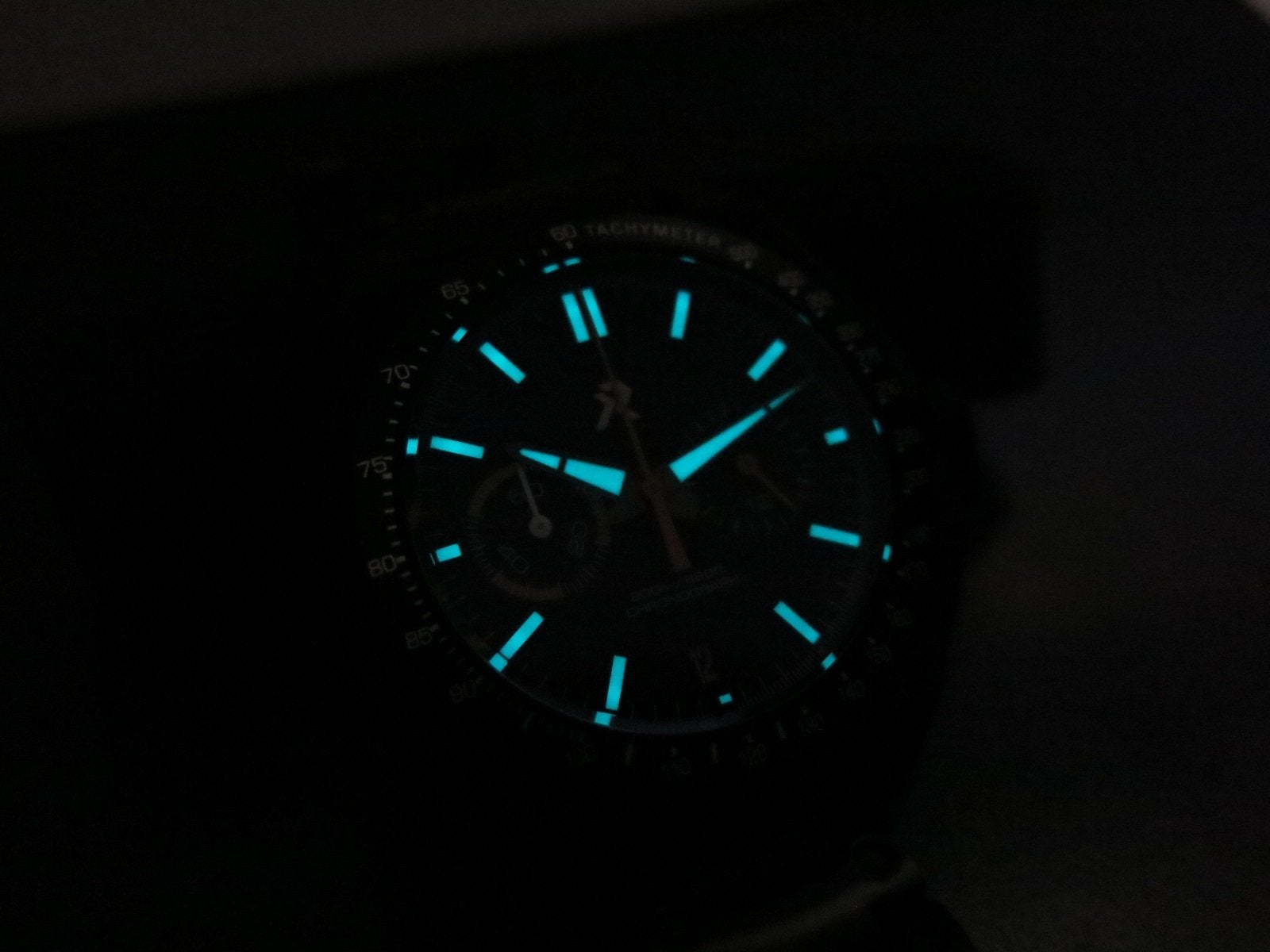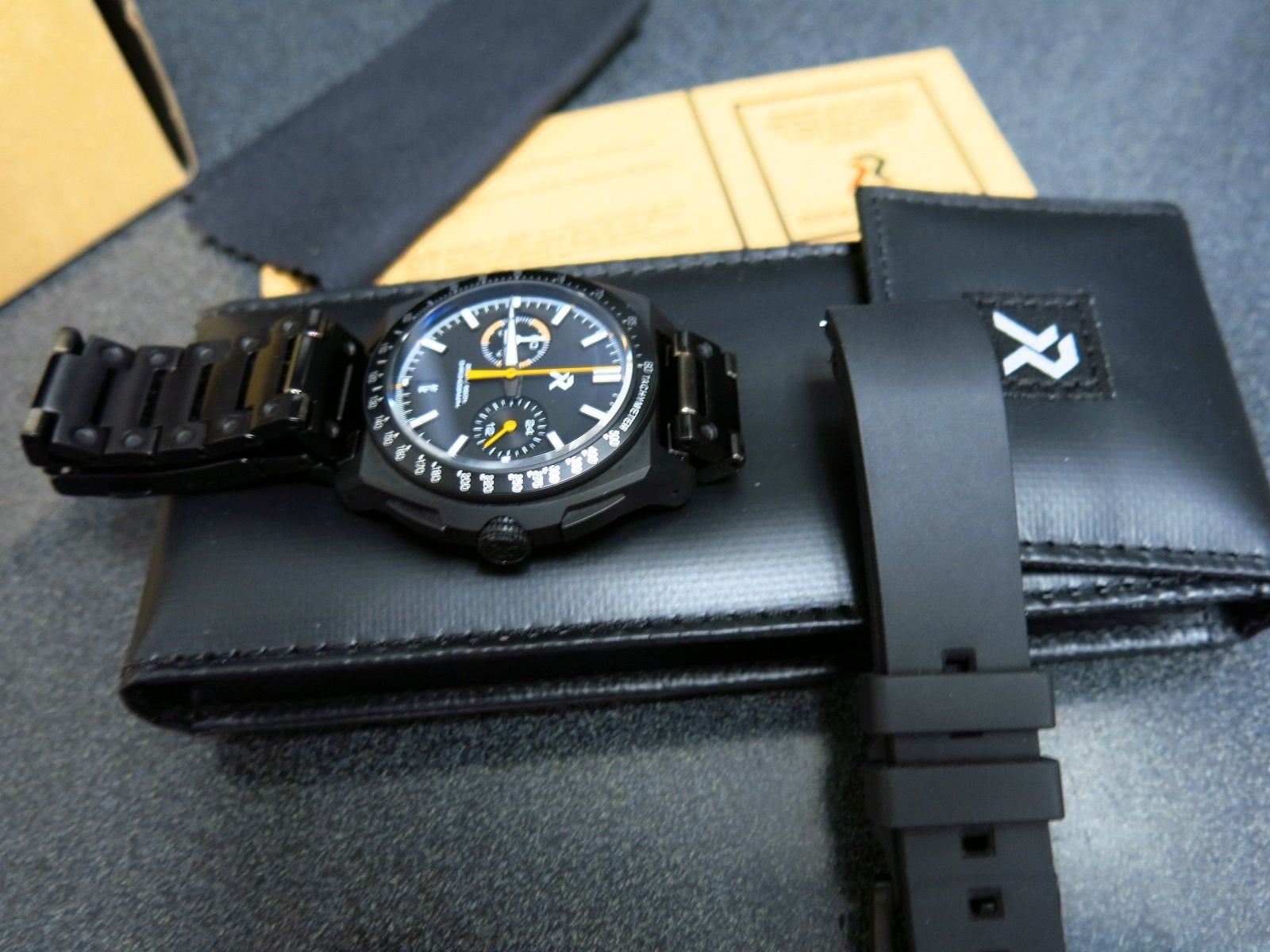 RZE Chonograph Valour, Titanium case black PVD coated, 42mm with 20mm lugs. White and orange accents made this very legible. Sapphire crystal and blue BGW9 lume. The watch is in excellent condition with only a small mark that I can see just above the top pusher. Everything works as it should, crown is smooth and positive, the pushers start and stop the seconds hand and reset it crisply and precisely to the 12 position.