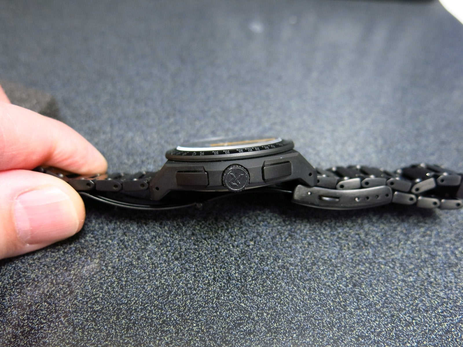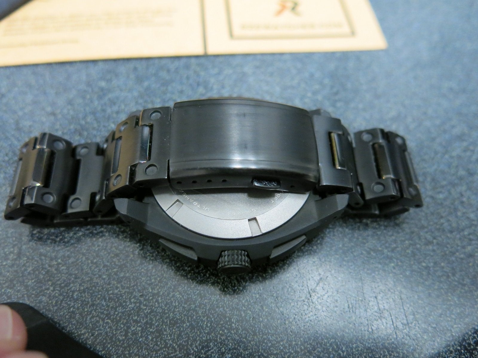 Material: The watch case, crown, pushers, and bezel are made of titanium with an UltraHex coating for added scratch resistance. The buckle is stainless steel with a titanium coating.