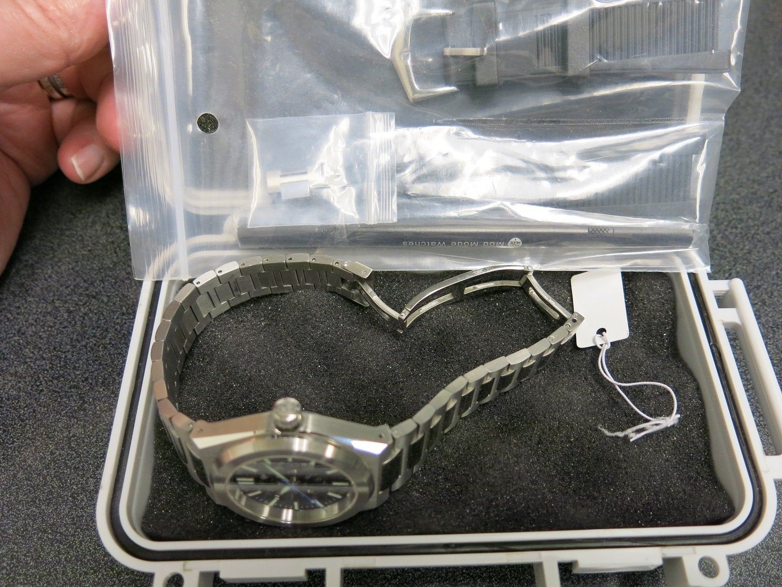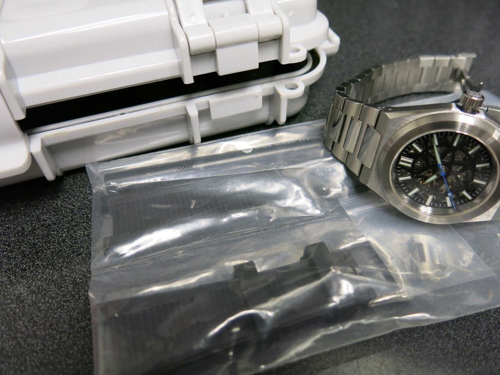 Comes with an extra link for the bracelet (sized for about 8 1/4" now) and an original rubber strap so you can change the looks of the watch. There is also some kind of tool which I did not open from the packaging.