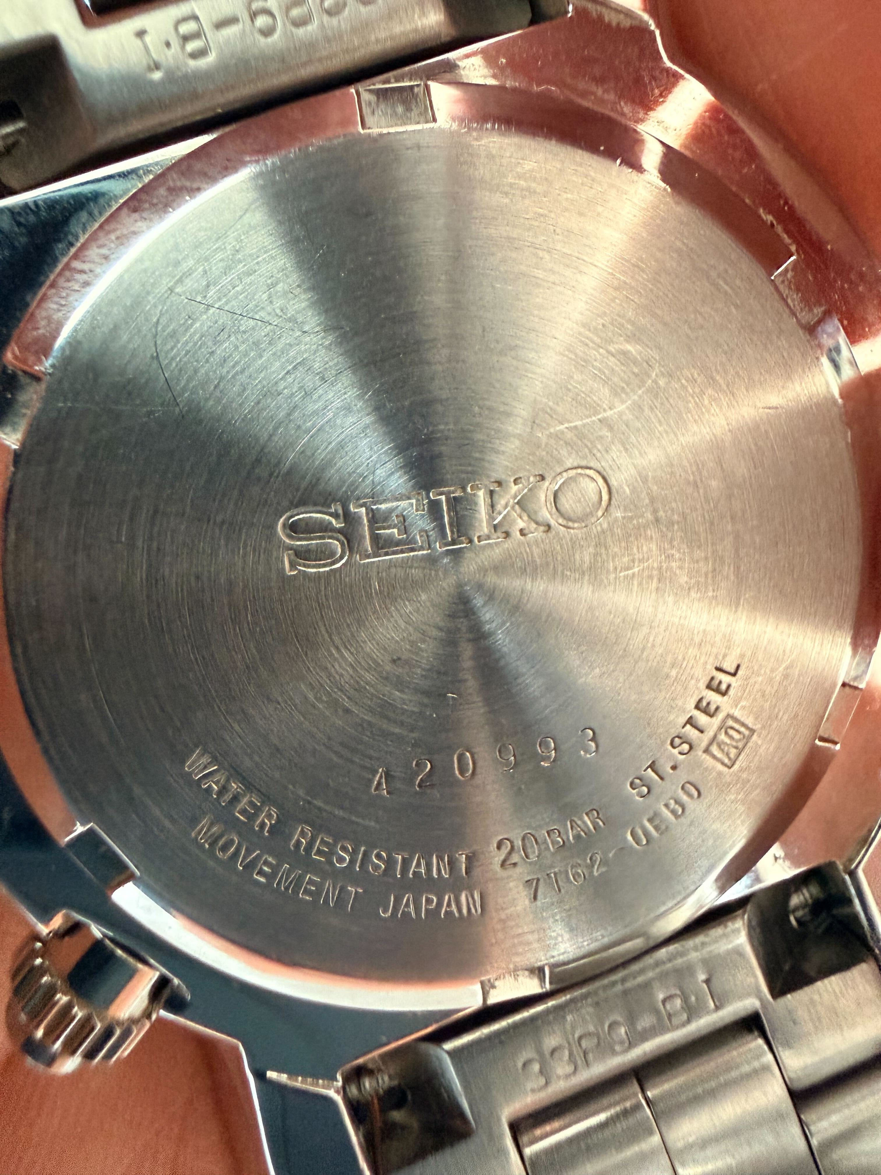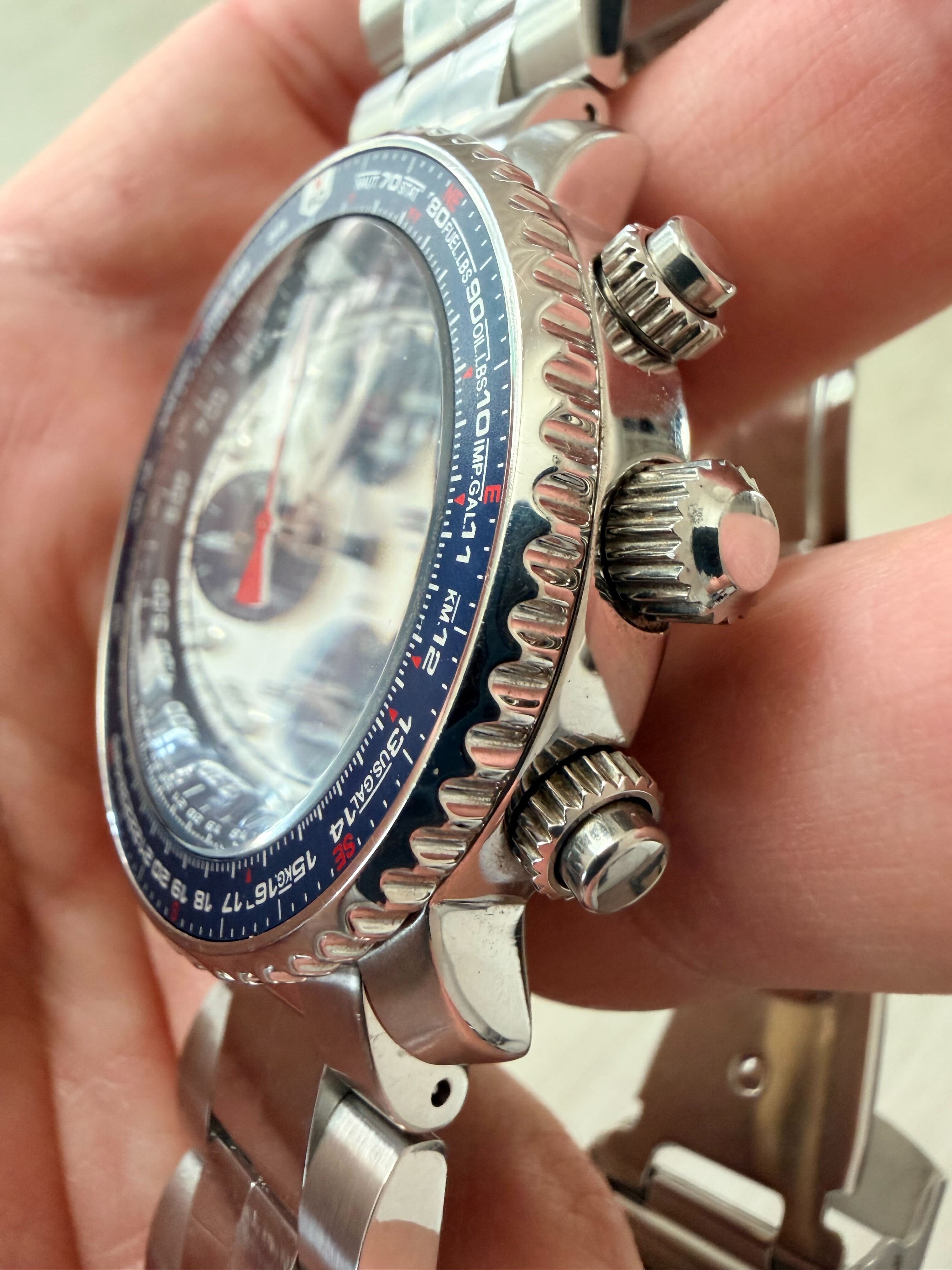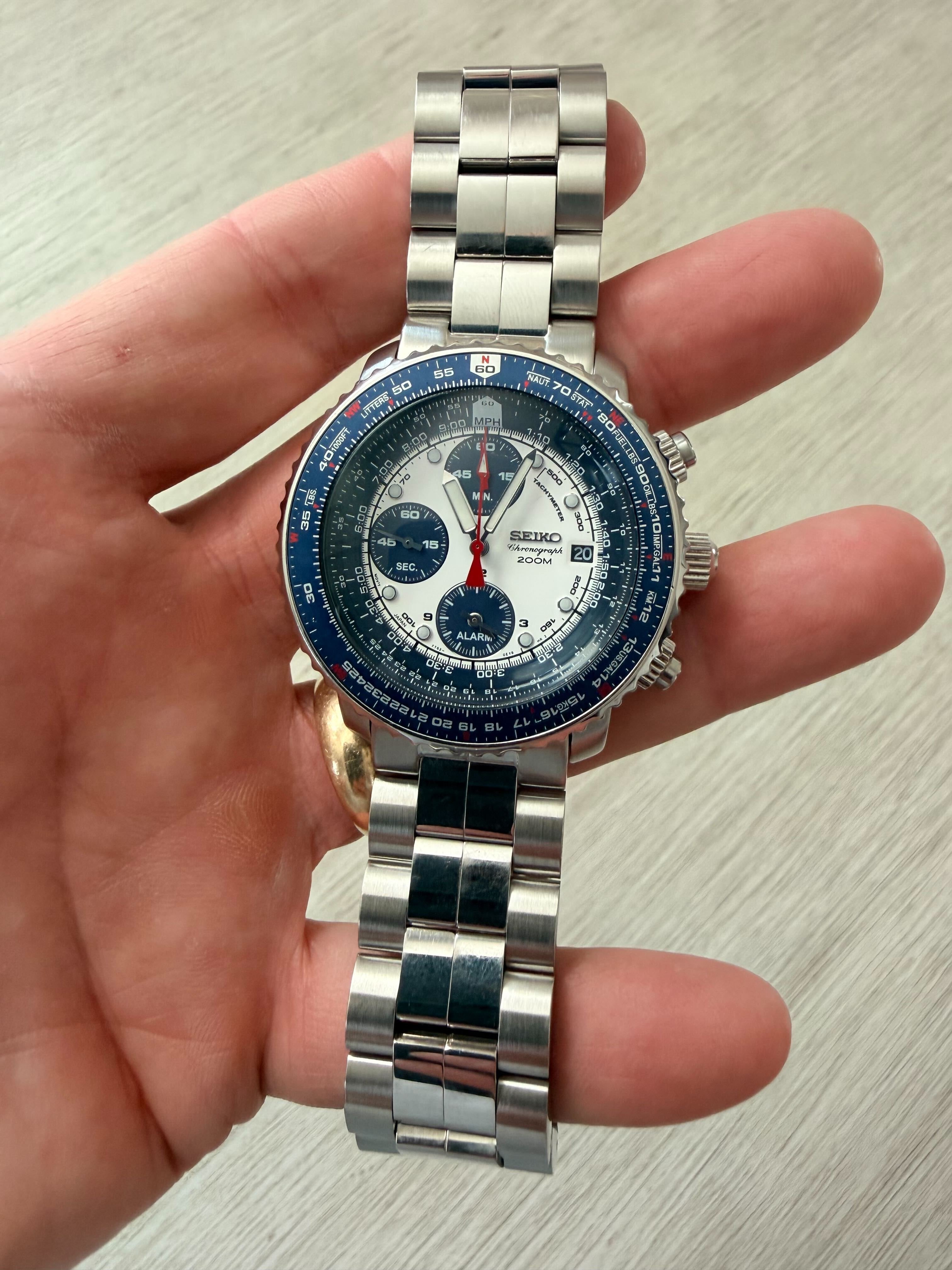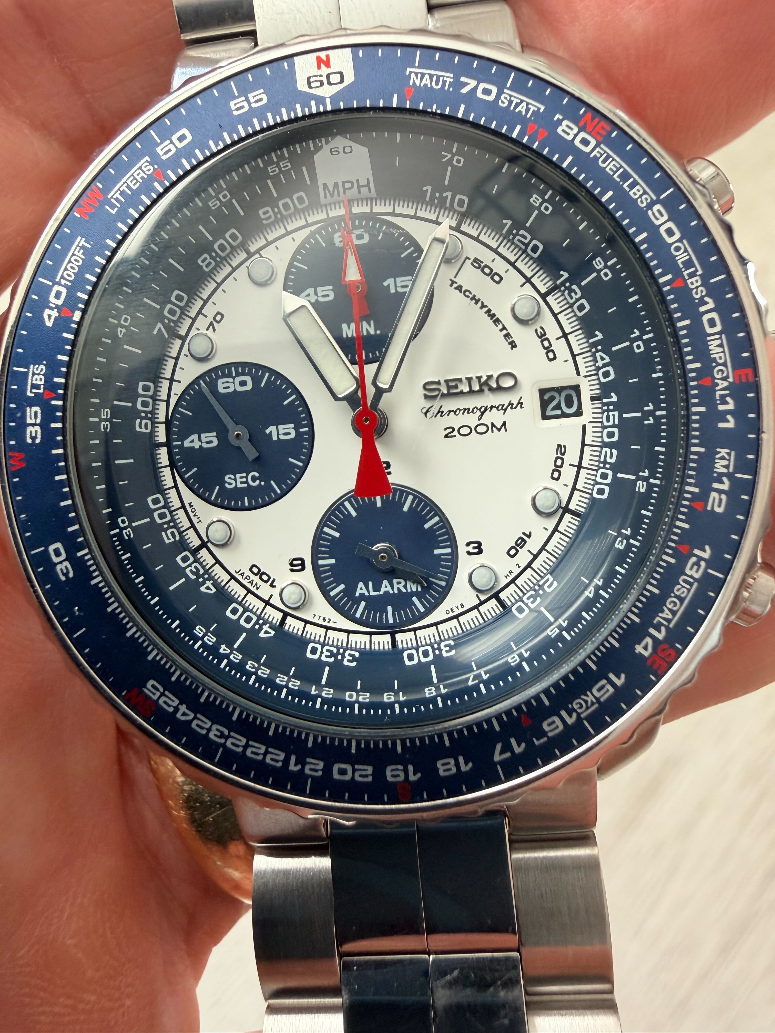 Seiko Flightmaster SNA413P with original bracelet and fresh battery. A bit tougher to find than it's black counterpart, this watch is running great - stops, starts, resets to zero. Flight computer bezel, no box or papers, just the watch as shown.
