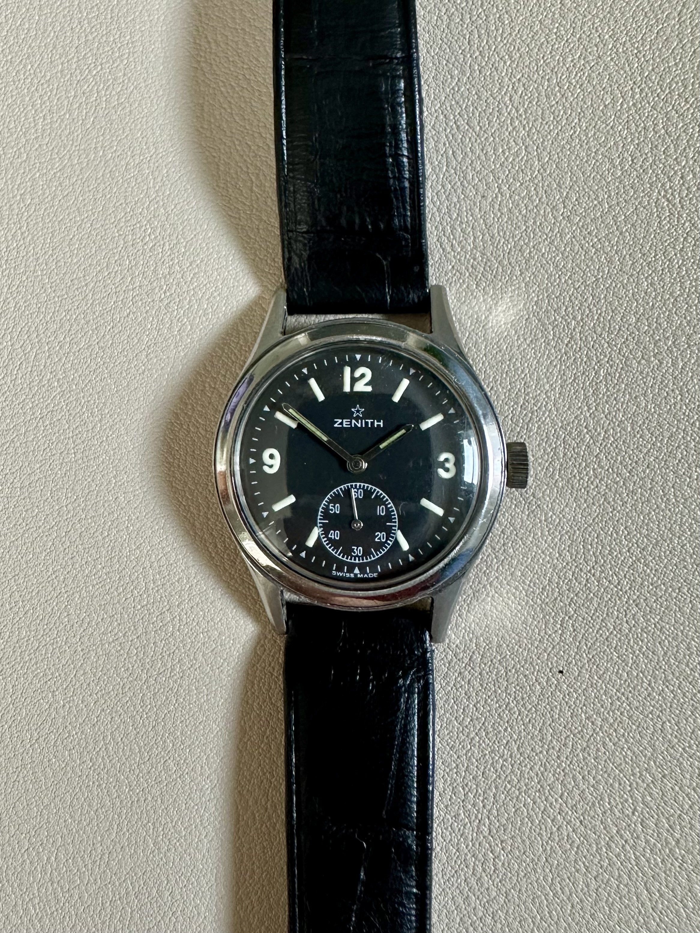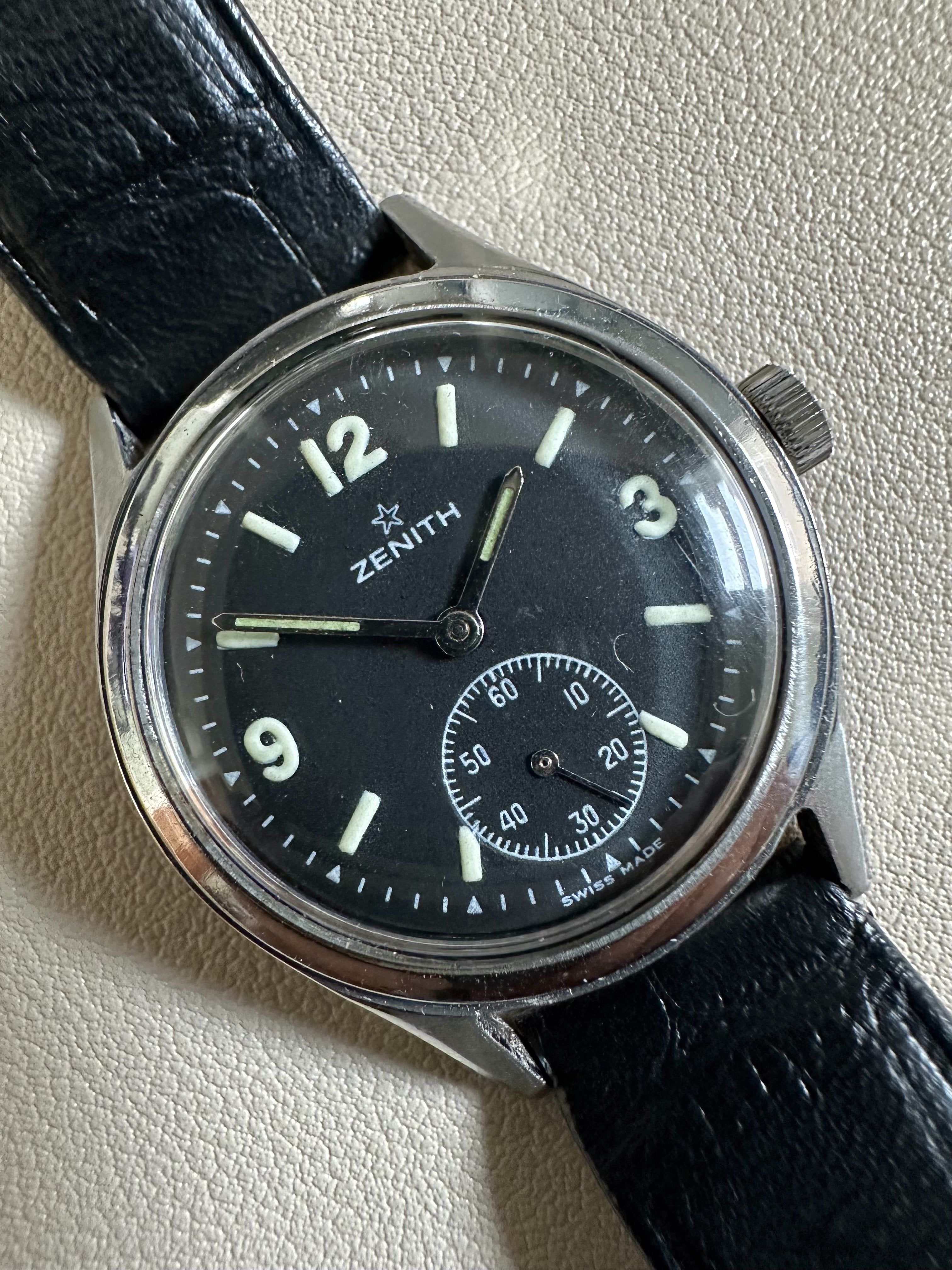 Details: This is a beautiful military watch from Zenith. The dial is really good looking and in top condition. Comes fitted with a leather strap, and is in solid working condition.