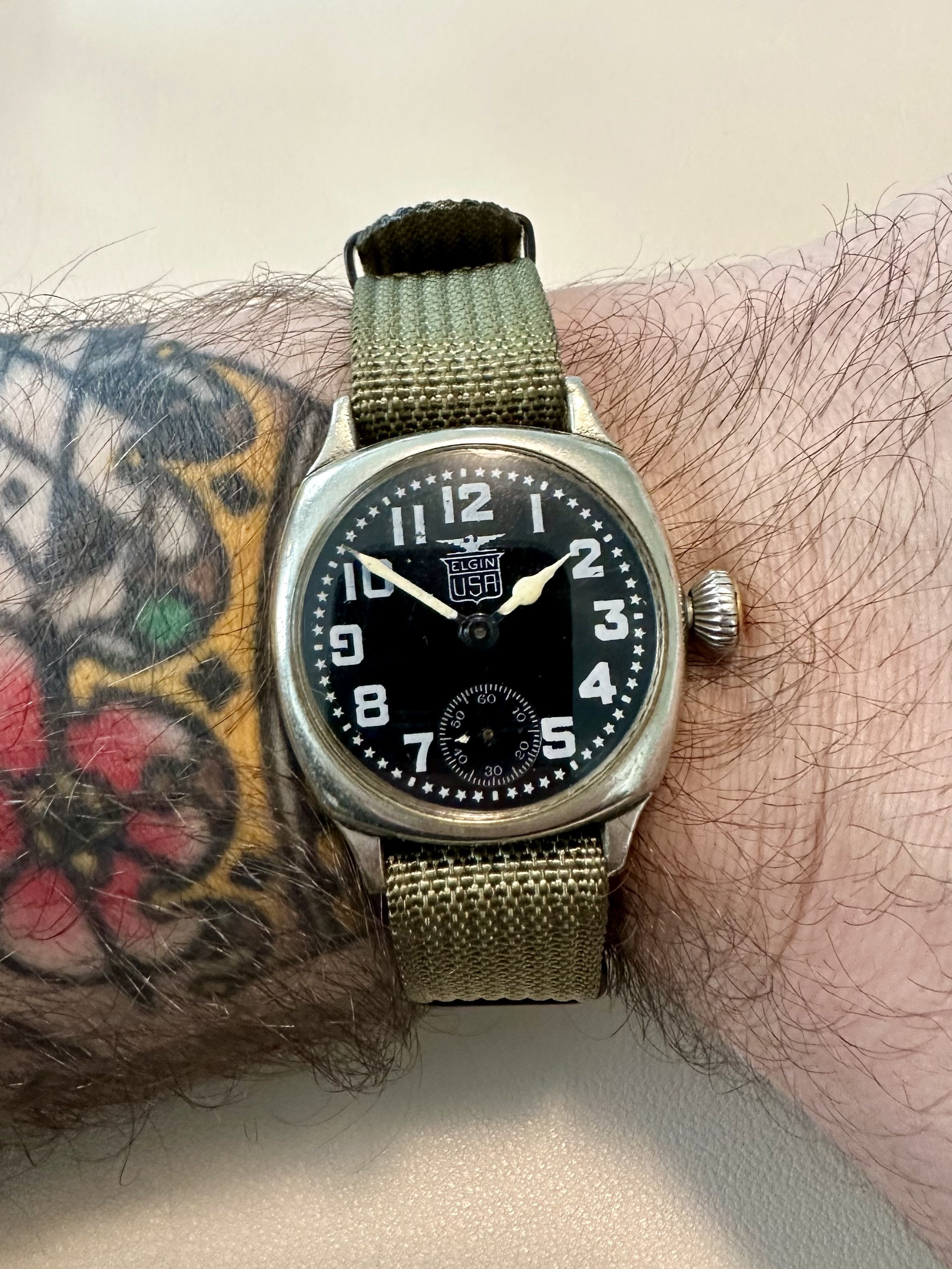 Details: Really cool little Elgin military watch, issued in 1925. Manual wound, and still runs well! I believe the hands look like they were re-lumed at some point, but everything else looks fantastic, including the star dial!