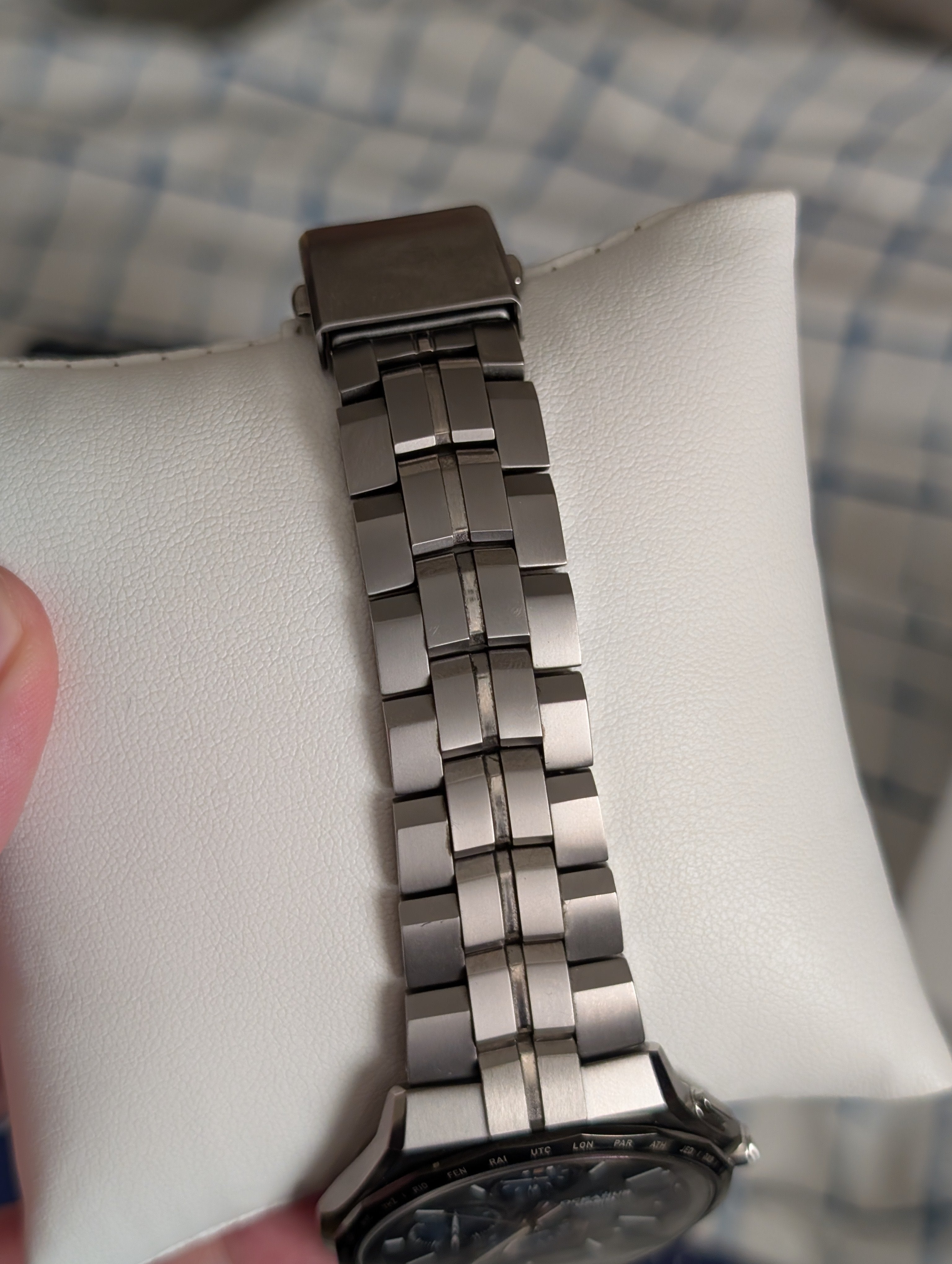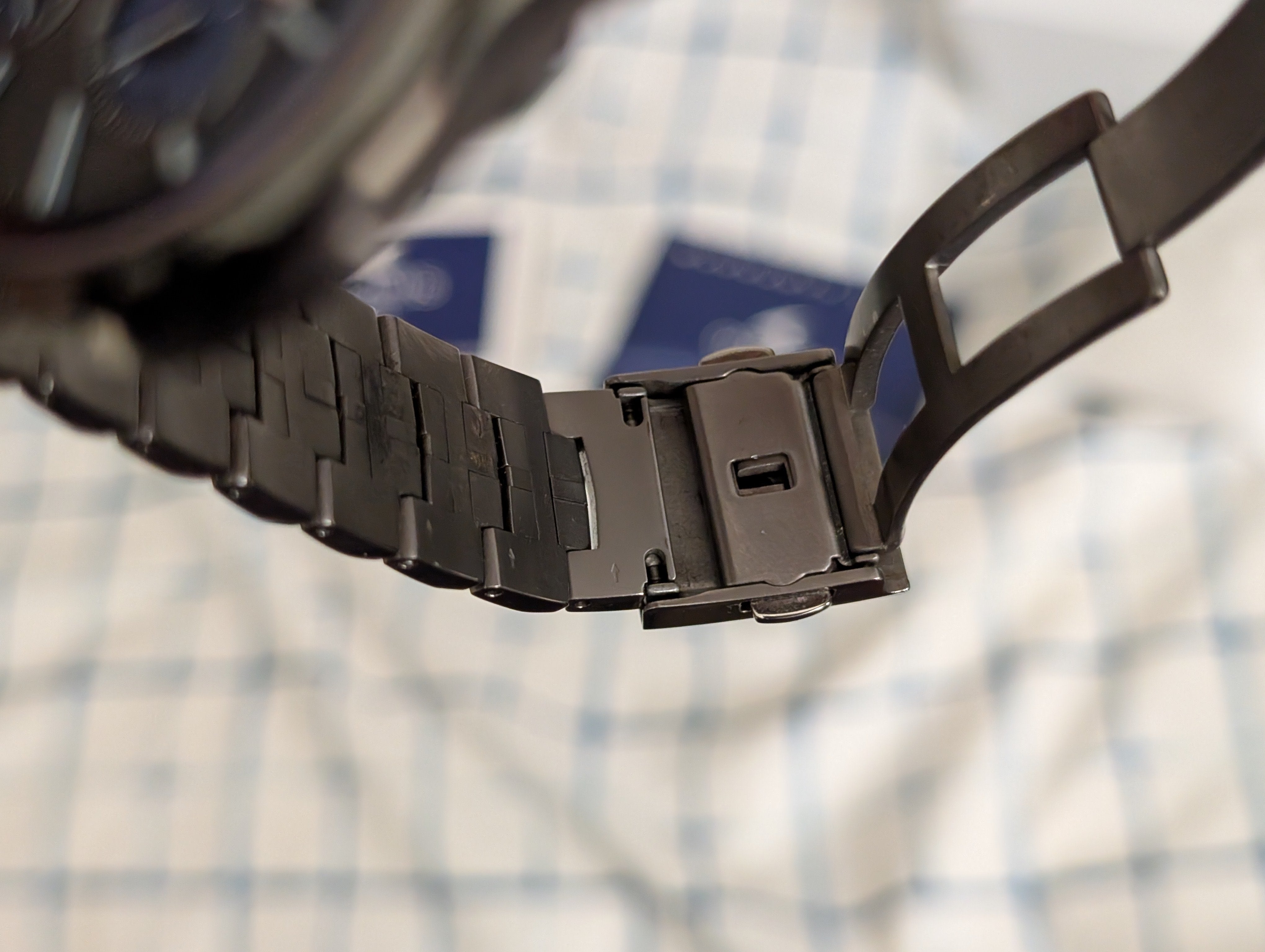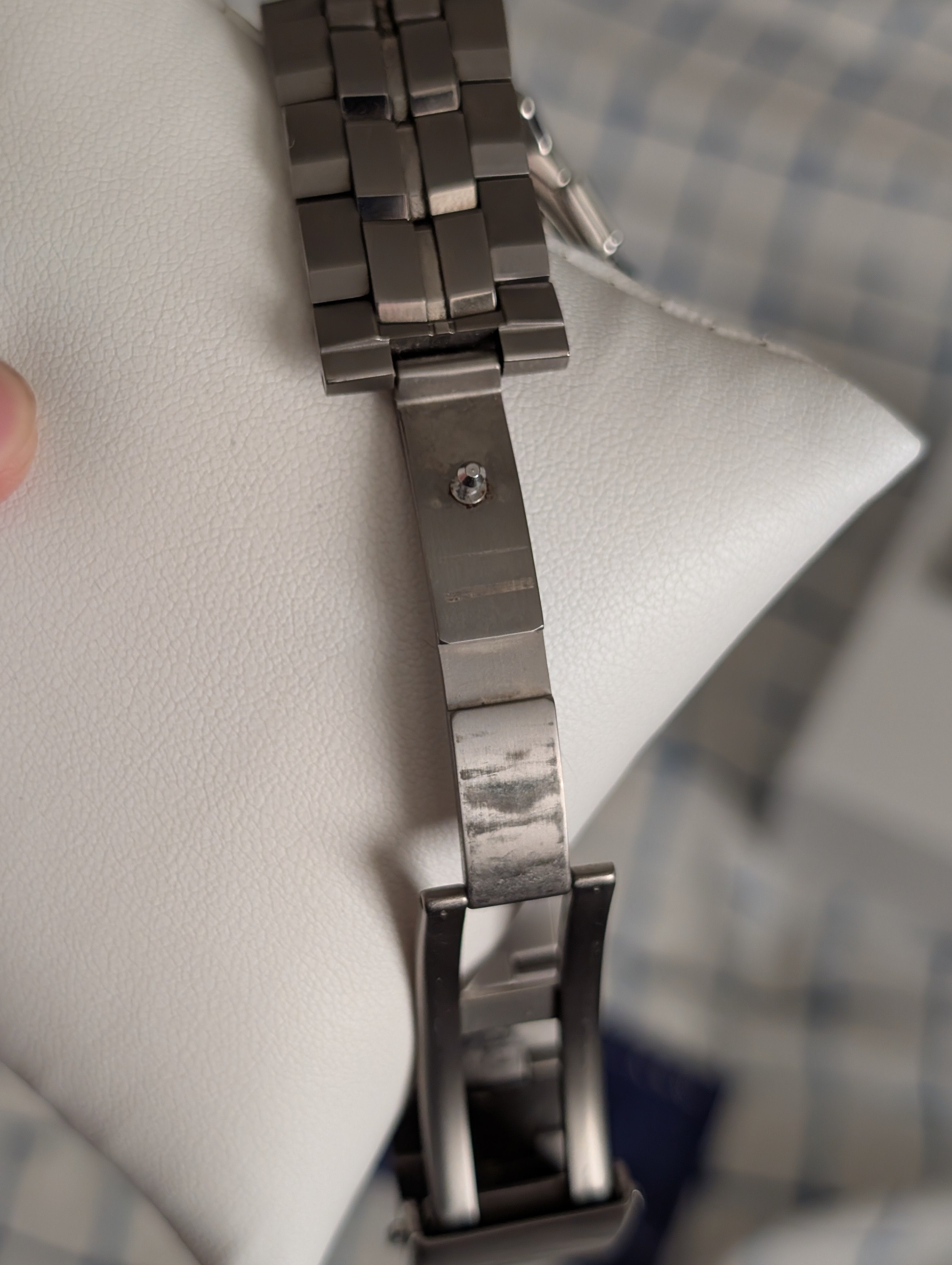 Most of the wear on this watch is on the integrated bracelet. There are some light scratches on the bracelet and deployant clasp, but most of the wear is on the inside of the bracelet where the titanium rubs against each other. There are also some light marks on the black external bezel. There is a hard coating that has been applied to the bracelet so this has helped with preventing scratches.
