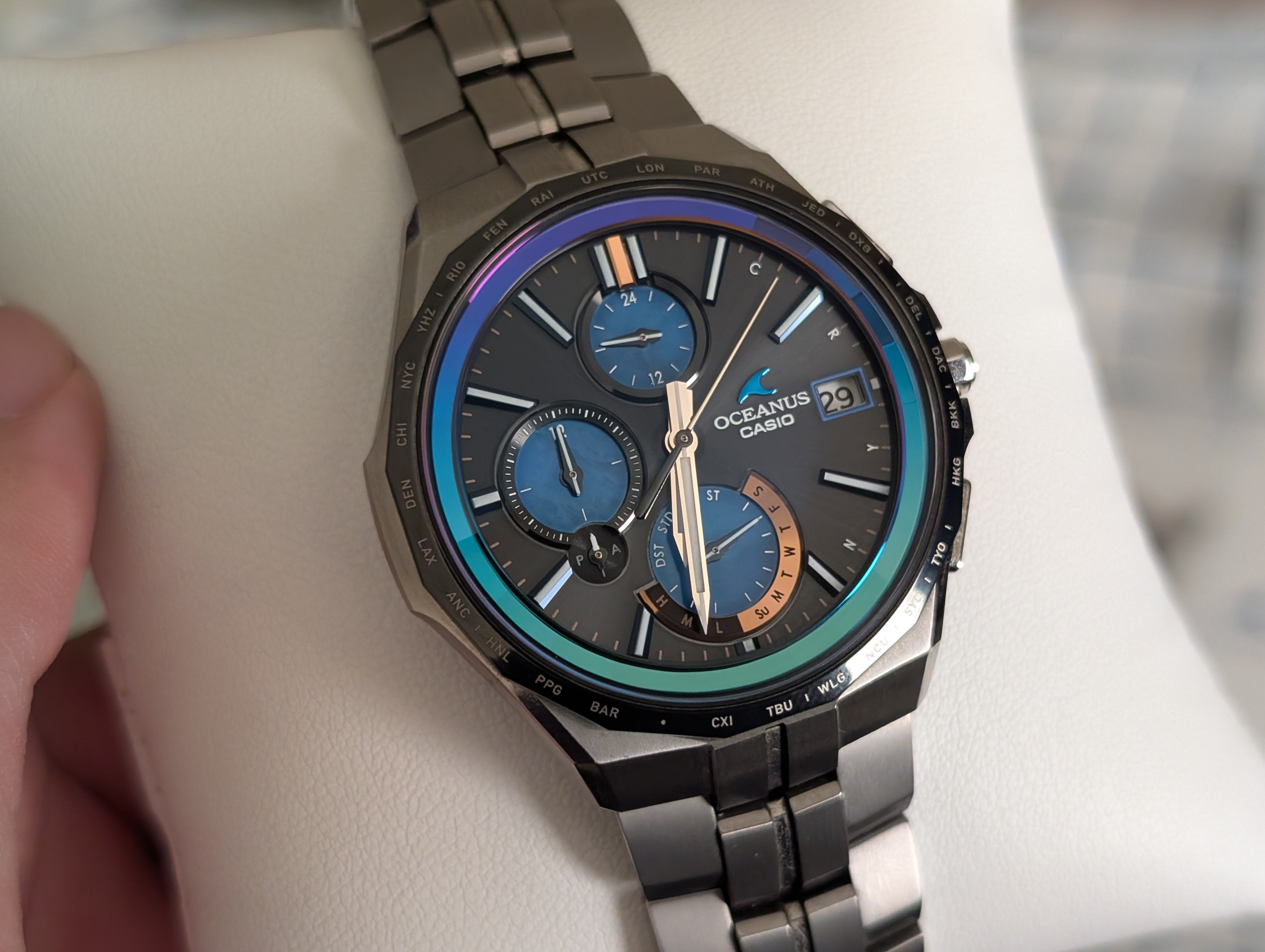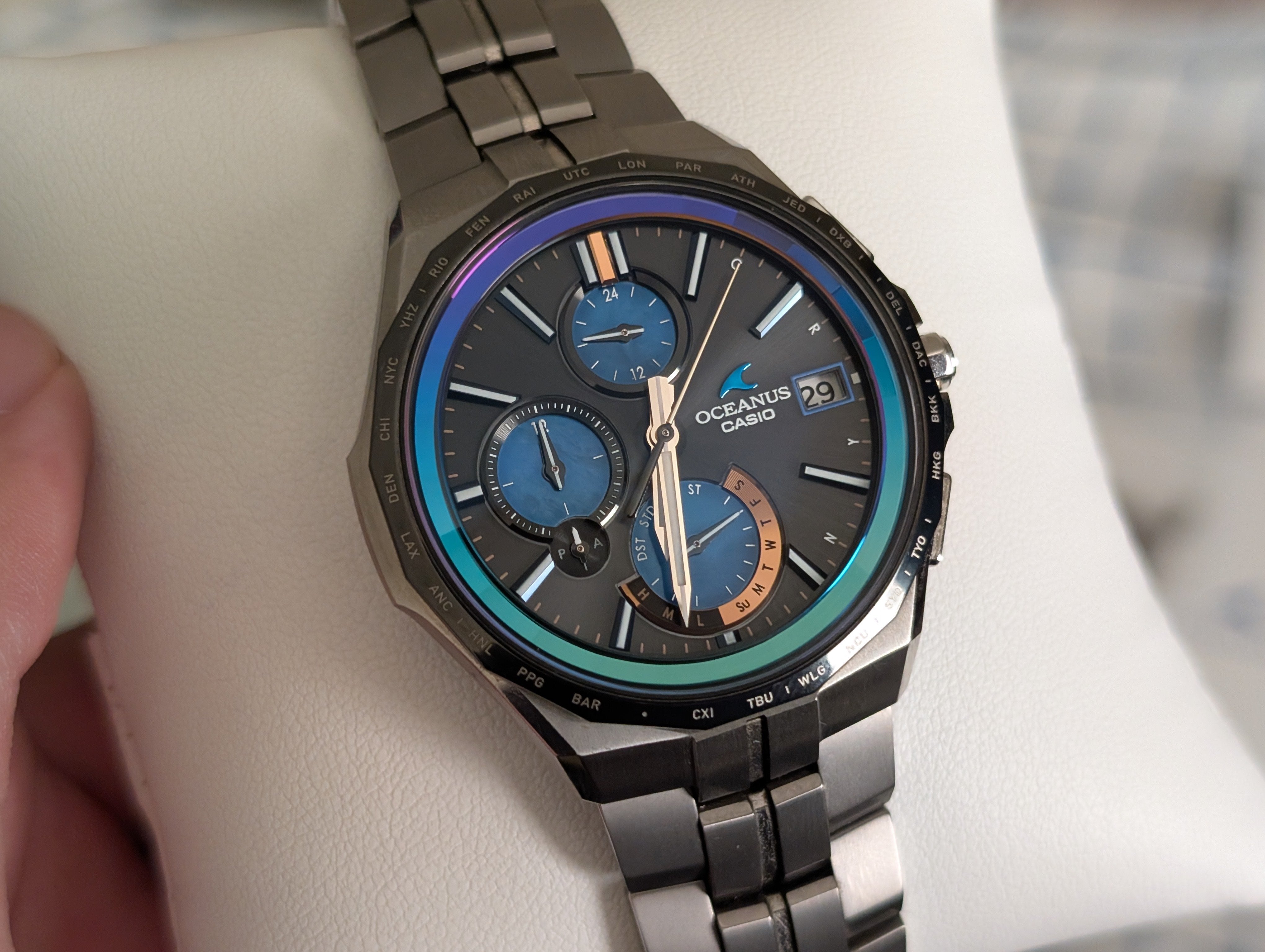 Looking to downsize the collection against so for sale today is this limited edition Casio Oceanus S5000C with the beautiful 24 faceted sapphire inner bezel, blue mother of pearl subdials, and rose gold accents.