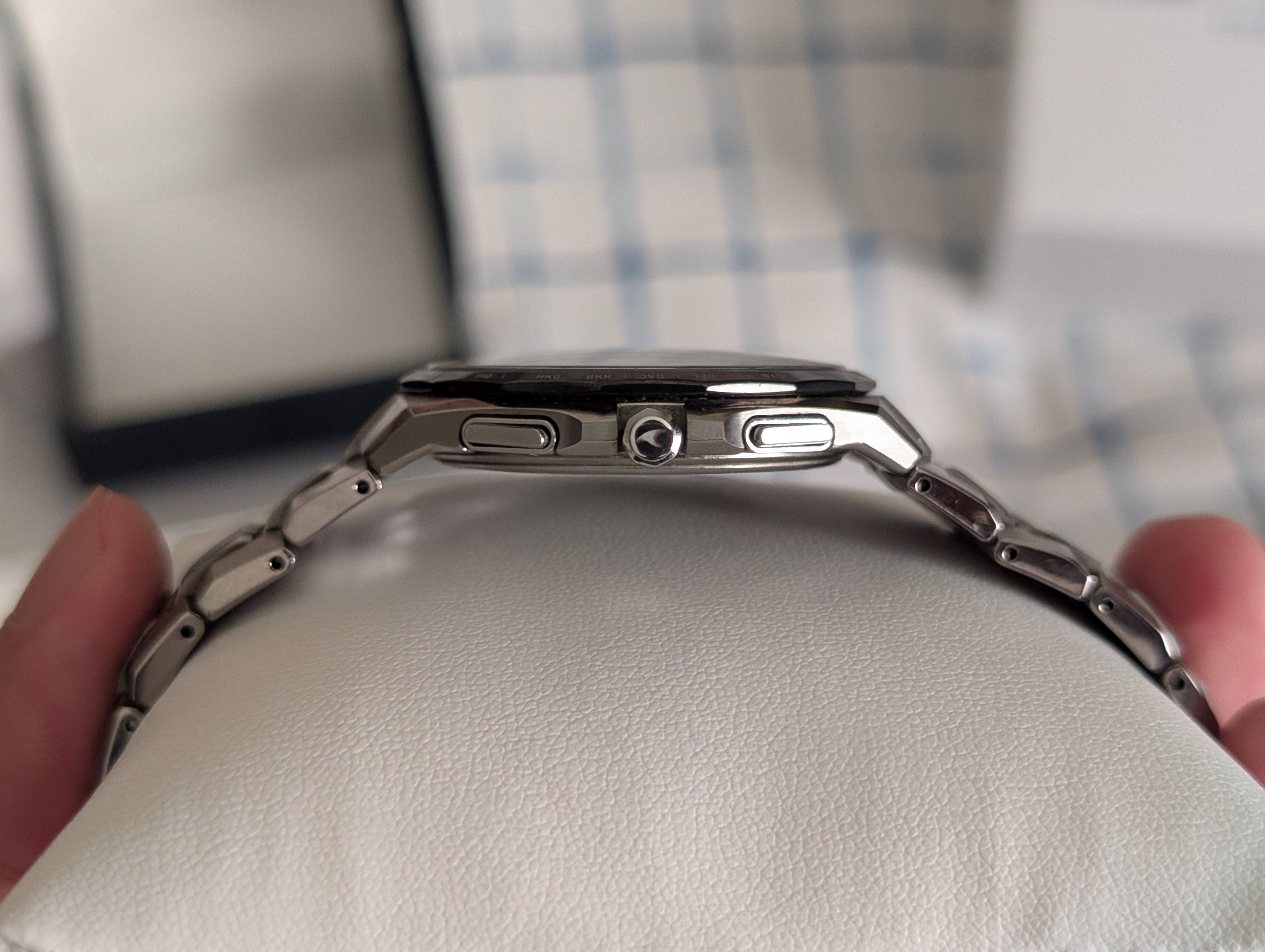 This watch is one of my favorite quartz watches I've owned. It wears very well on the wrist at 9.5mm thick including the domed sapphire crystal. The case and bracelet are also made of titanium so the watch is super lightweight. Casio module 5603 has a ton of functionality with the ability to track a second timezone or act as a stopwatch up to 24 hours on the 9 o'clock subdial. The 6 'clock dial with the rose gold border shows the day of the week. The date turns over exactly at midnight (takes a couple of seconds) and the date will always be correct as long as the perpetual calendar is set. the watch is solar powered so it will need to be exposed to light every now and then.